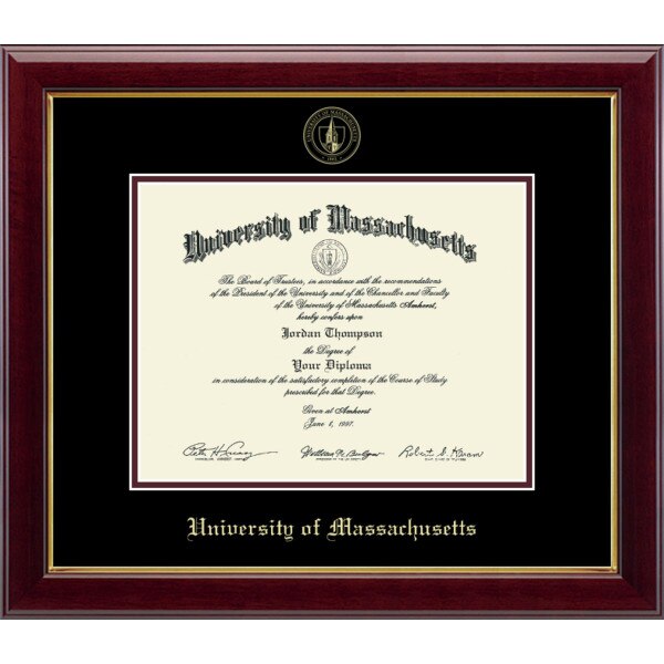 Solid hardwood, high-gloss cherry finish diploma frame with inner gold lip in black/burgundy matte featuring a gold embossed UMass Amherst seal at the top of frame and gold embossed "University of Massachusetts" at the bottom of the frame.