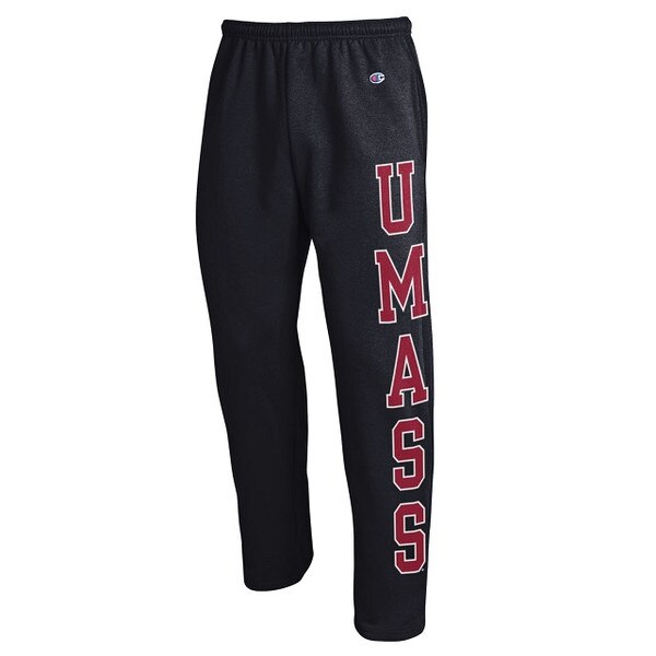 Unisex open bottom sweatpants in black featuring "UMass" along the left leg, with a 31-inch inseam, side pockets, and an inside quick cord at the waistband.
