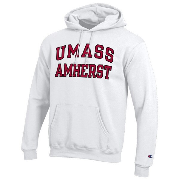 Unisex pullover hoodie in white featuring "UMass Amherst" printed across the chest. Features a double layer hood with a draw-cord and a front pouch pocket.