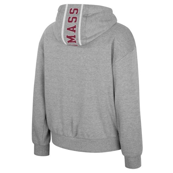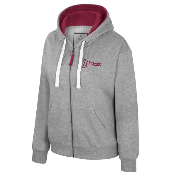Layer up in cozy campus style with this women’s UMass full-zip hoodie. The front features an embroidered “UMass” script logo on the chest, complemented by a soft maroon-lined hood and white drawstrings for a classic collegiate look. On the back, bold “UMASS” lettering runs down the center of the hood, adding an extra pop of school pride.